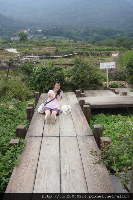 話說在竹子湖某個海芋田下面有一條小溪流,瞳拔坐在階梯上講電話,瞳瞳就窩在把拔旁邊,盯著下面看。